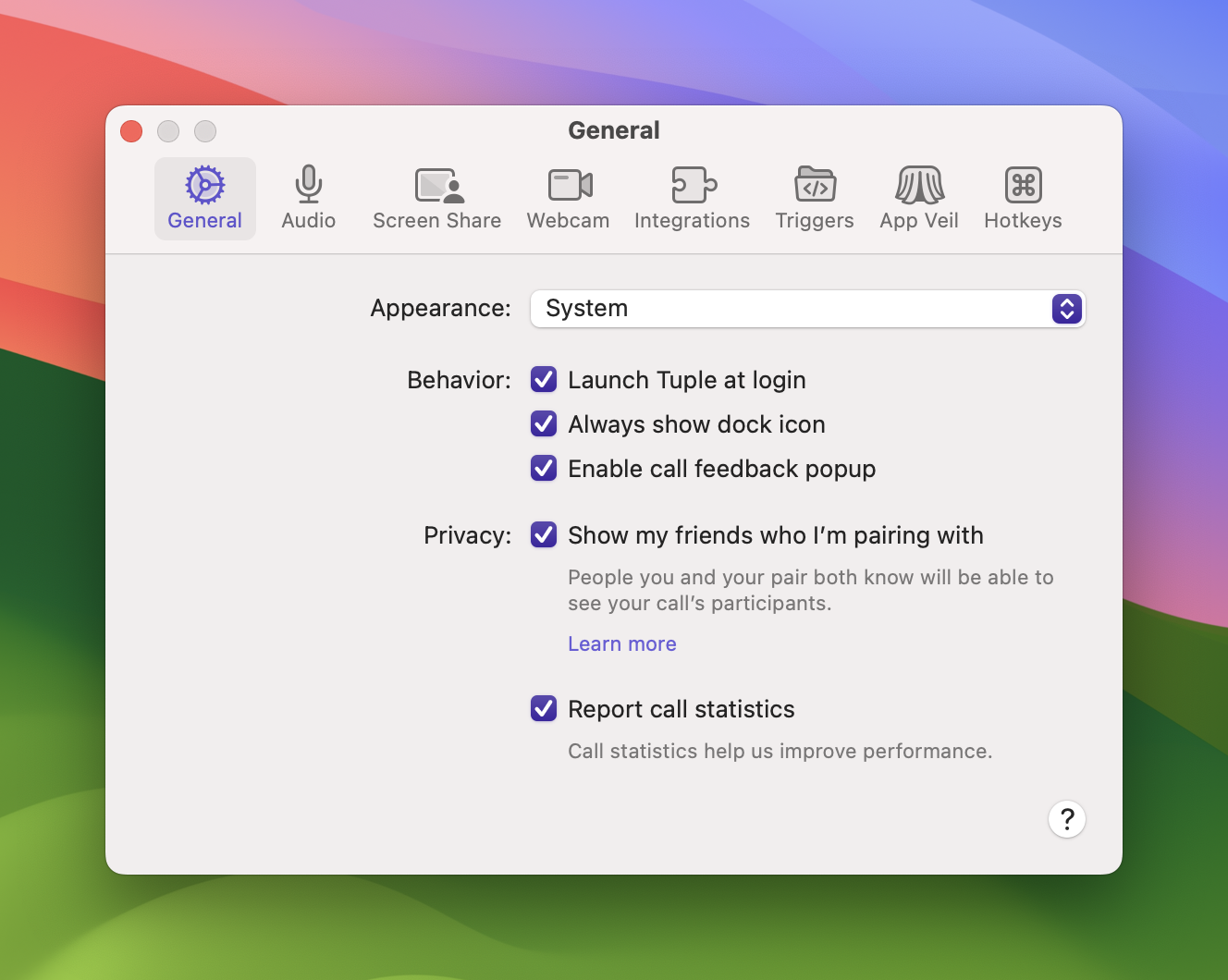 When this feature is enabled, Tuple will automatically launch when you log into your computer after a restart or explicit logout. Note that it will not launch if your computer is merely locked or asleep.