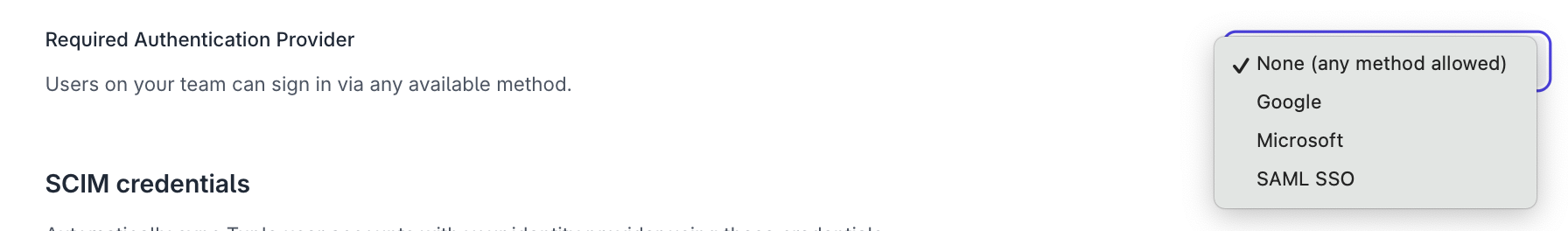 Tuple gives users the ability to sign up and sign in with Google. Team owners have the ability to select Google, Microsoft, or SAML SSO as a required authentication provider; if none is selected, users can choose how they want to authenticate. The setting can be changed in the team settings tab: